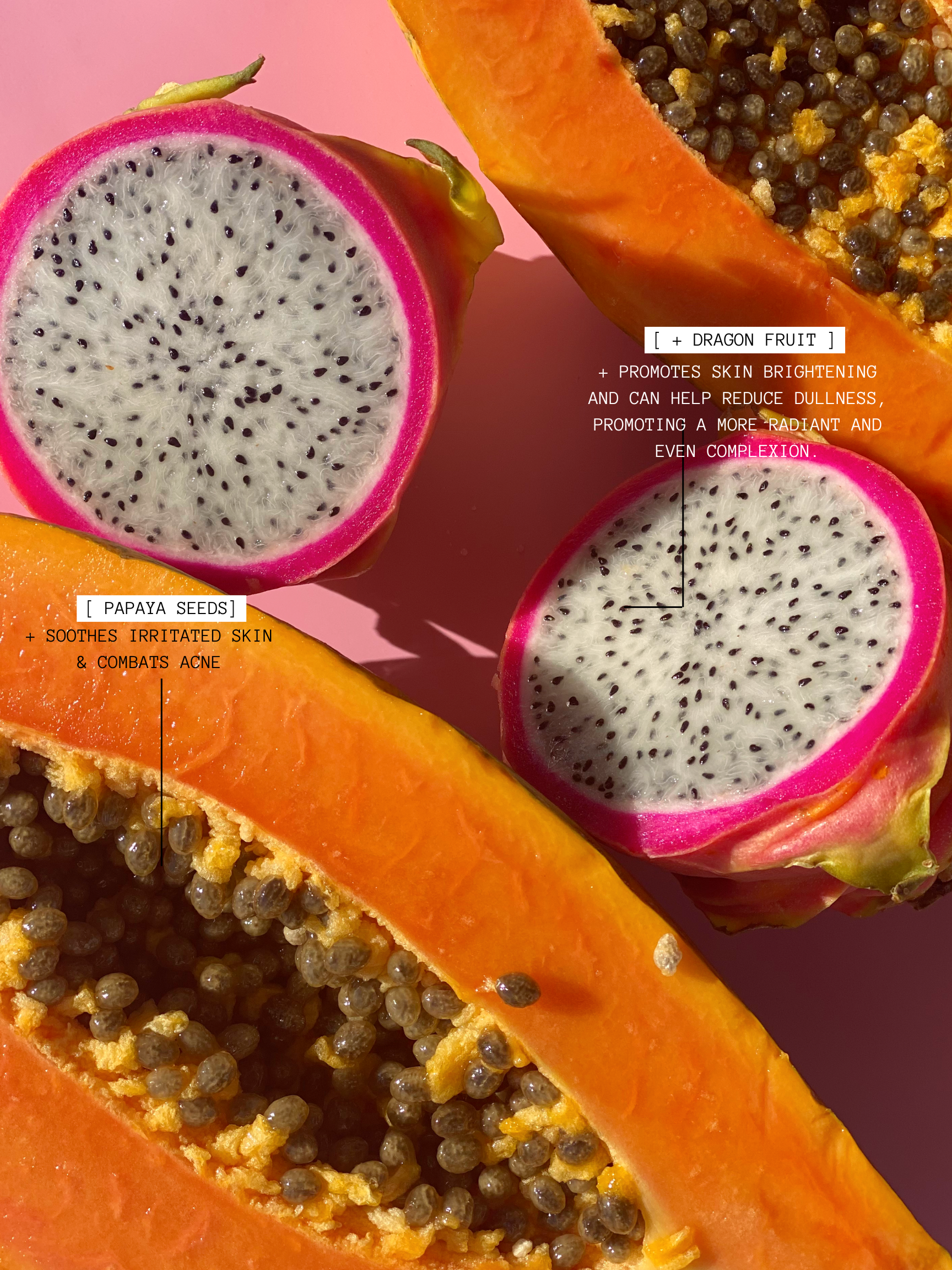 Aqua (Water) , Aloe barbadensis Leafjuice , Vegetable glycerine , Papaya seed oil,Plant based emulsifiying wax, Cetyl alcohol , Mango butter , Watermelon seed oil , papaya enzymes, Dragon fruit extract, lactobacillus ferment, Propylene Glycol , Diazolidinyl Urea , Iodopropynyl Butylcarbamate