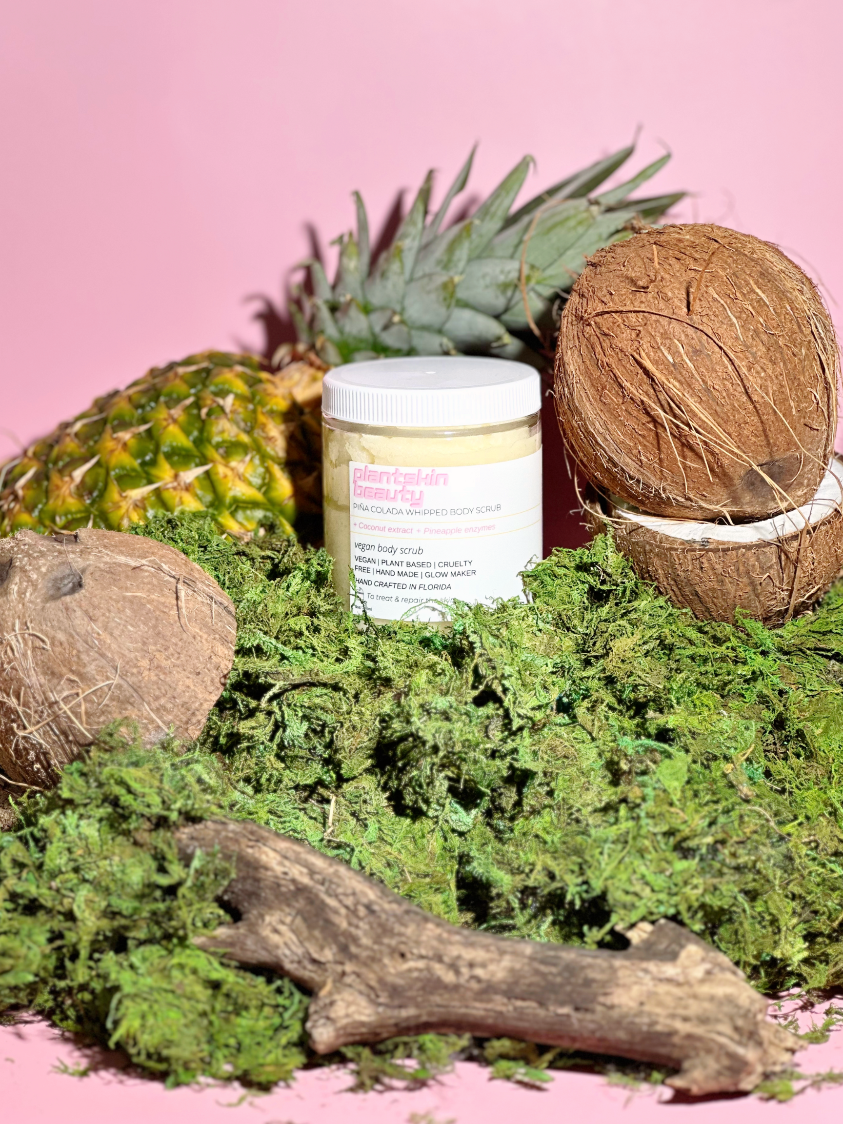 Organic cane sugar , Coconut extract, Prunus ,Cocos Nucifera(coconut)oil, Shea butter, ,Cetyl alcohol ,plant based emulsifier ,Helianthus(sunflower)seed oil, Sweet almond oil , Pineapple enzymes, Rosa canina (Rosehip) oil , lactobacillus ferment, Propylene Glycol , Diazolidinyl Urea , Iodopropynyl Butylcarbamate , Fragrance .